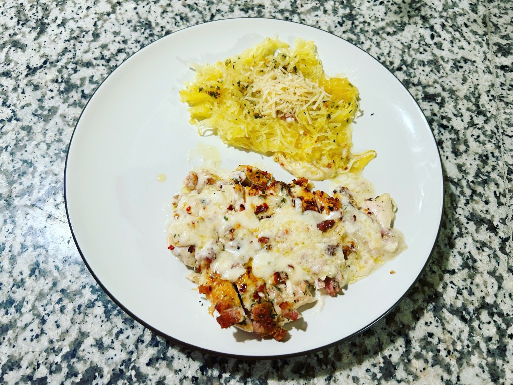 Bacon chicken Alfredo with spaghetti squash.