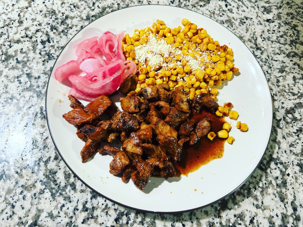 Soppin sauce on pork loin with spicy as hell sweet corn and pickled red onion.