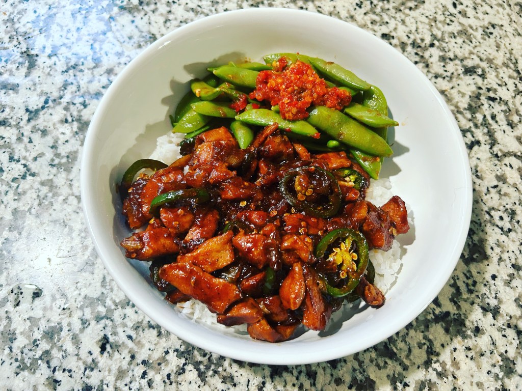 Some pork bulgogi over steamed rice w/ a side of sriracha soy sugar snap peas.