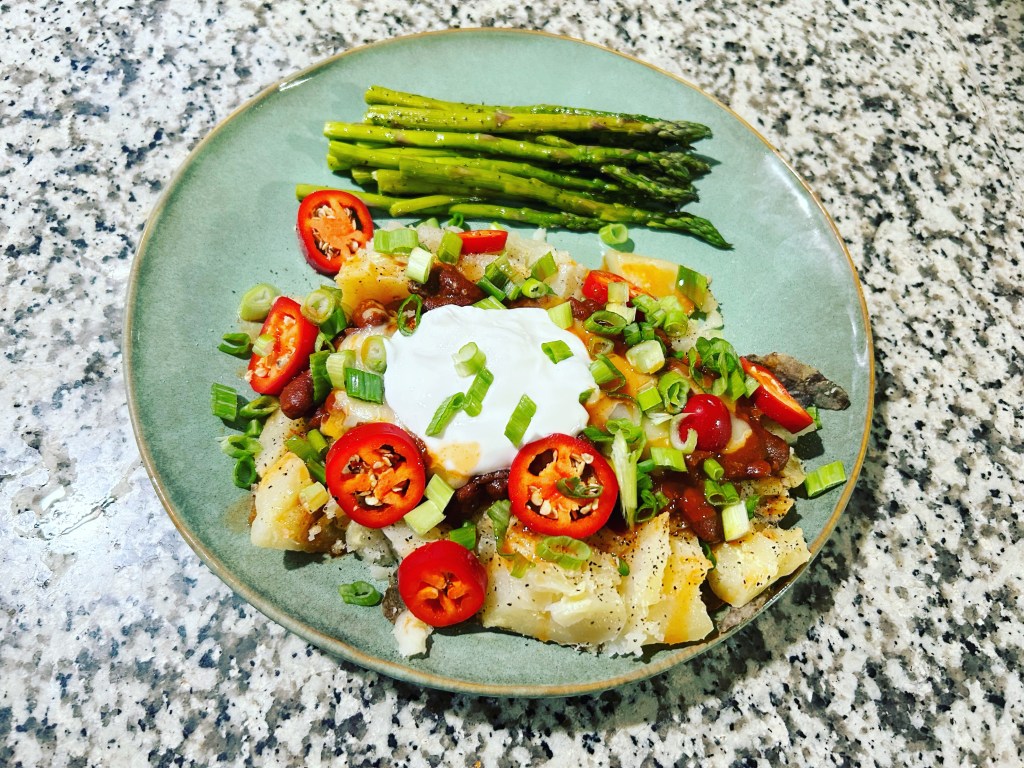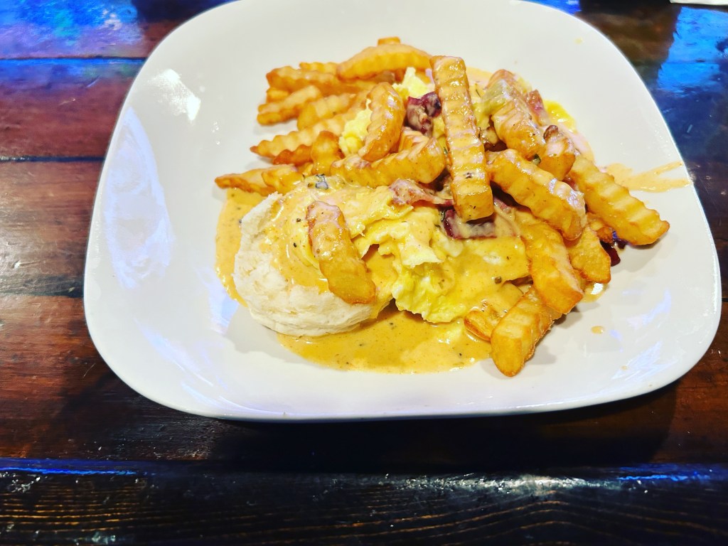 Sunday brunch. Biscuit with gravy, egg, bacon & fries.