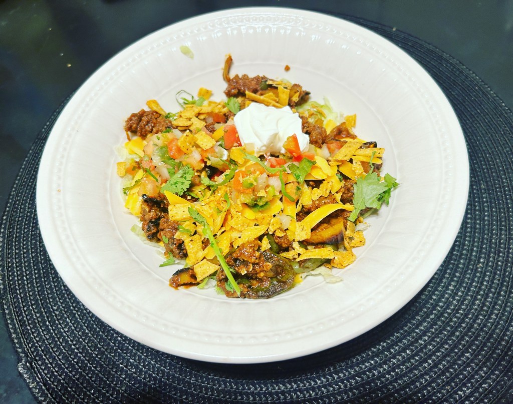 Ground beef fajita bowl. Seasoned meat, red, yellow green bell peppers, jalapeño and onion. Served over lettuce and topped with cheese, pico and sound cream. New recipe. Fantastic.