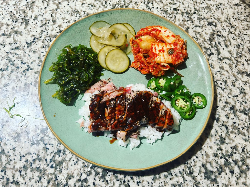 Tonight for Yvette and the 16 year old it was seared tuna, kimchi, seaweed salad & Japanese cucumber salad w/ sushi rice.