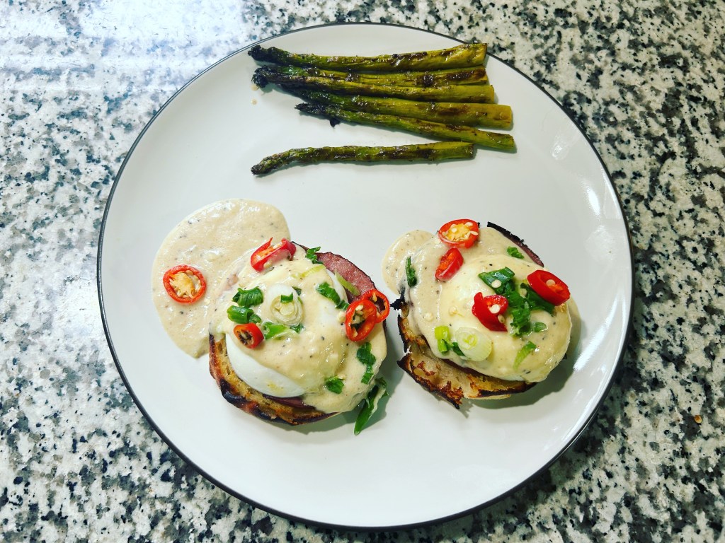 Eggs Benedict. I add some green sauce to the hollandaise sauce. We enjoyed our brunch.