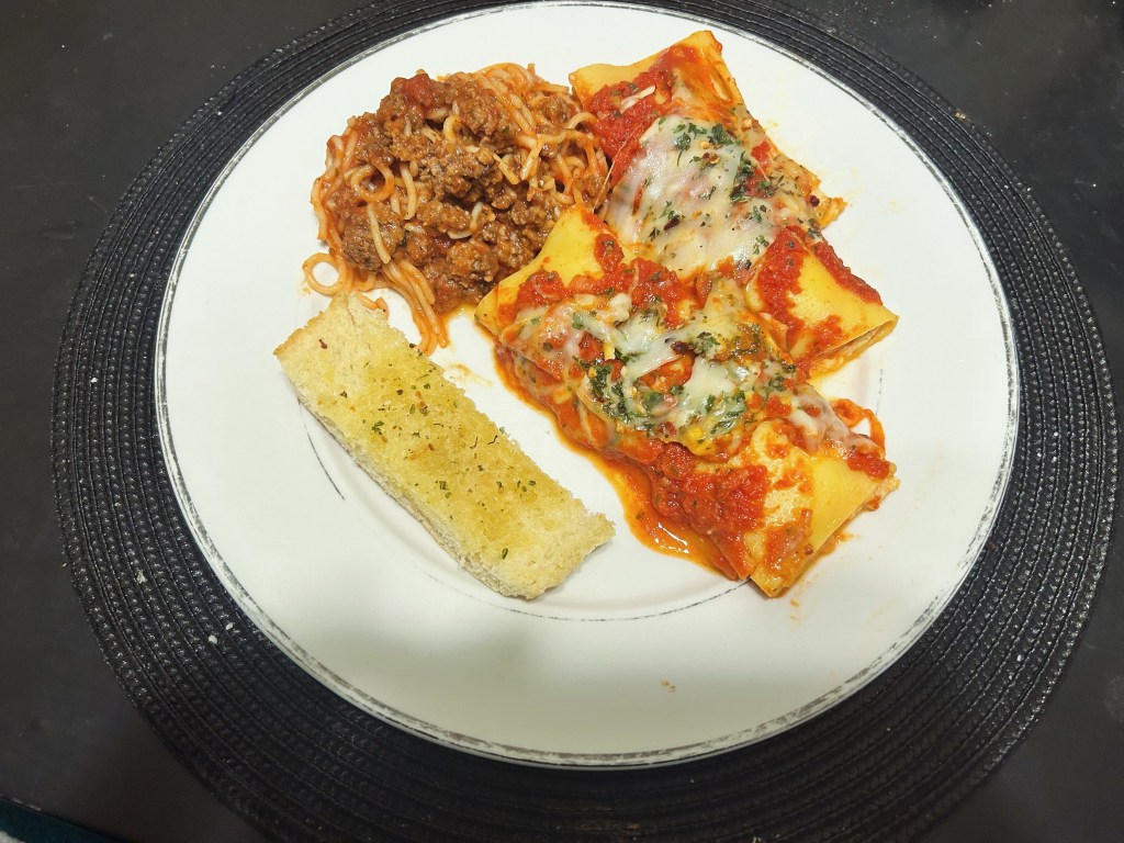 Cheese Manicotti, spaghetti and garlic bread.
