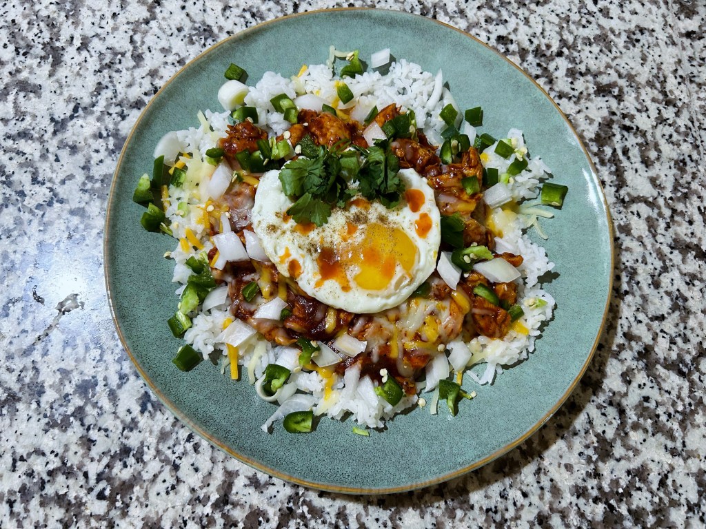 Red chicken enchilada chicken over sticky rice topped with a fried egg.