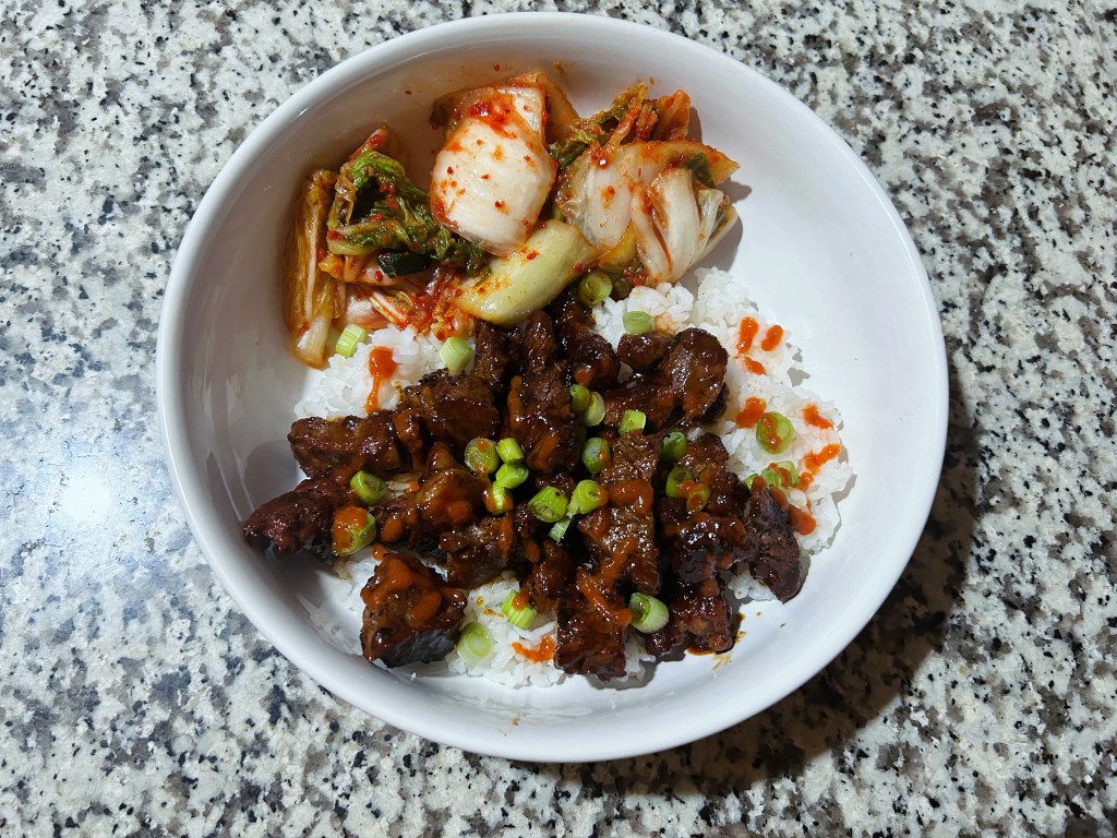 Korean BBQ steak, kimchi and rice.