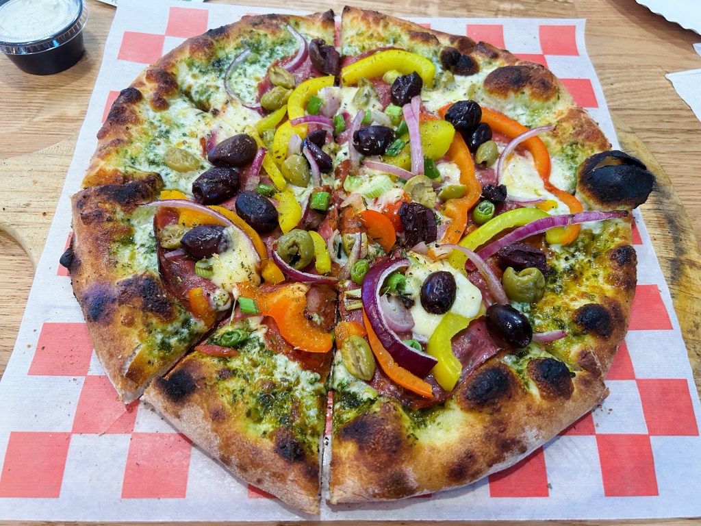 Saturday. Yvette and I went on a pizza date. Mediterranean. We also had some wings and good lord can she strip the meat off those bones.