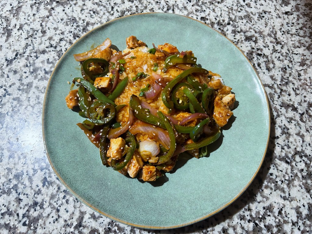 Spicy ginger chicken over rice.