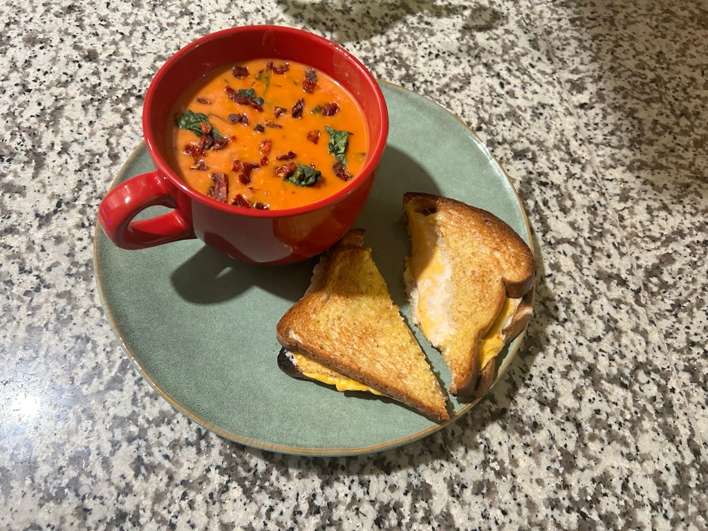 Homemade tomato bisque soup with a grilled cheese sandwich.
