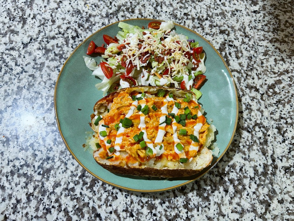 Buffalo chicken twice baked potato. This wasn’t my original plan for dinner. I was going to make a chicken fajita stuffed potato and then Yvette sent me a recipe. I had to try it and I’m glad that I did.