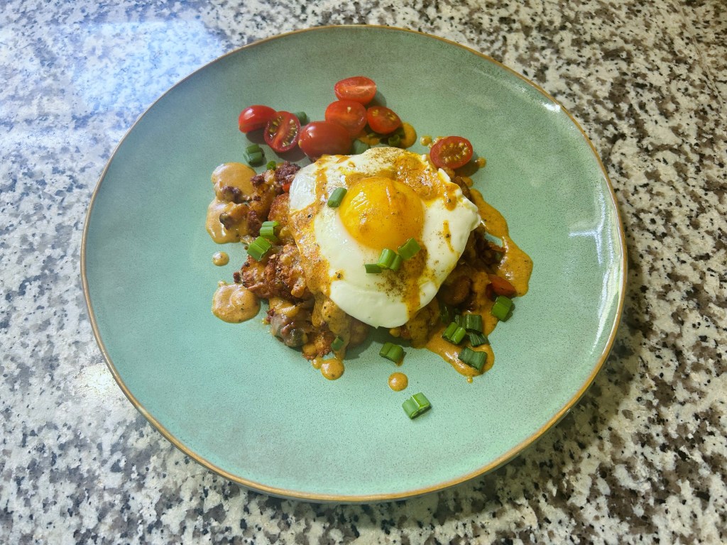 Saturday morning brunch with Yvette. Tatter tots & chorizo topped with cheese, hollandaise sauce, green onions and a sunny side egg.