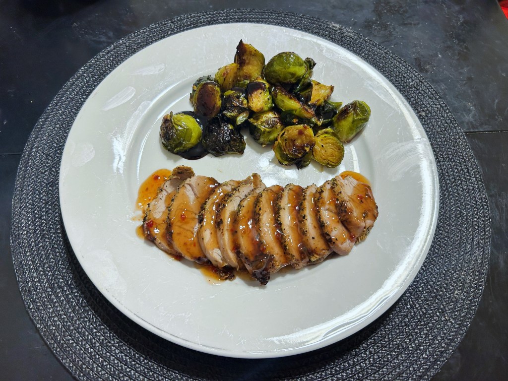 I made some Italian peppered pork tenderloin w/ raspberry chipotle & roasted Brussels w/ a balsamic glaze.