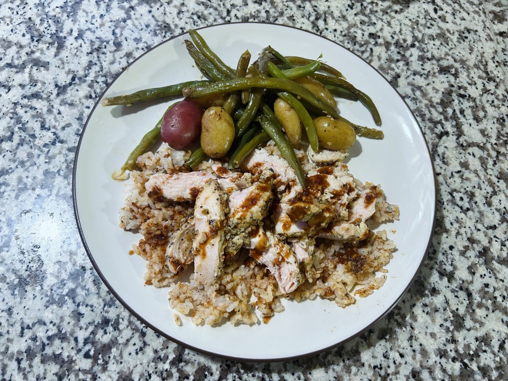 Chipotle chicken and rice with veggies. Nothing exciting on the eyes but the flavor was there.