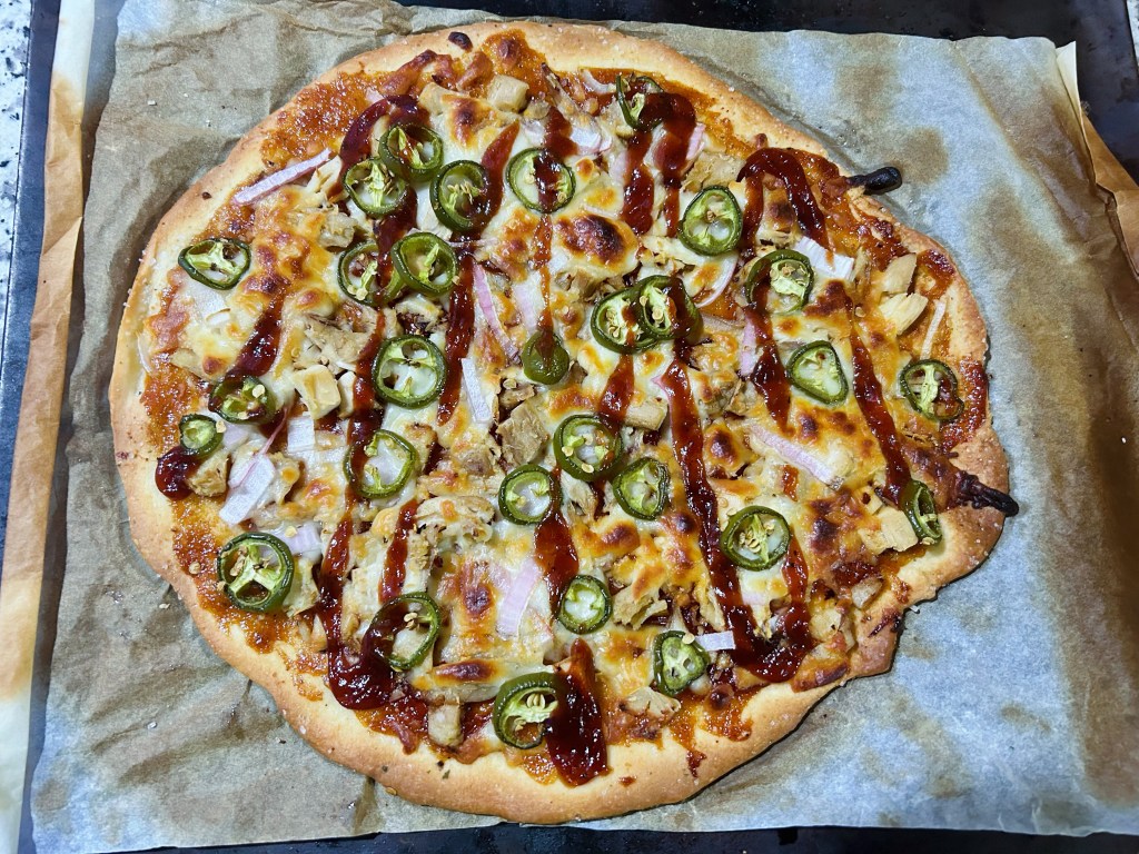 BBQ chicken pizza. I’ve always liked these toppings and I question why I only just not decided to make my own. It was fantastic and I was a gluten and ate it all through the night.