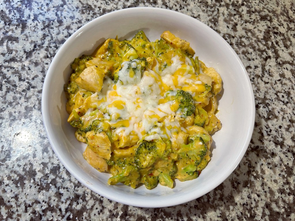 Skillet chicken divan. Chicken, broccoli, cream of chicken, mayo with curry powder and lemon juice. This is a simple quick take on one of my favorite meals my mom would make. Hers was a casserole. Melted cheese on top.
