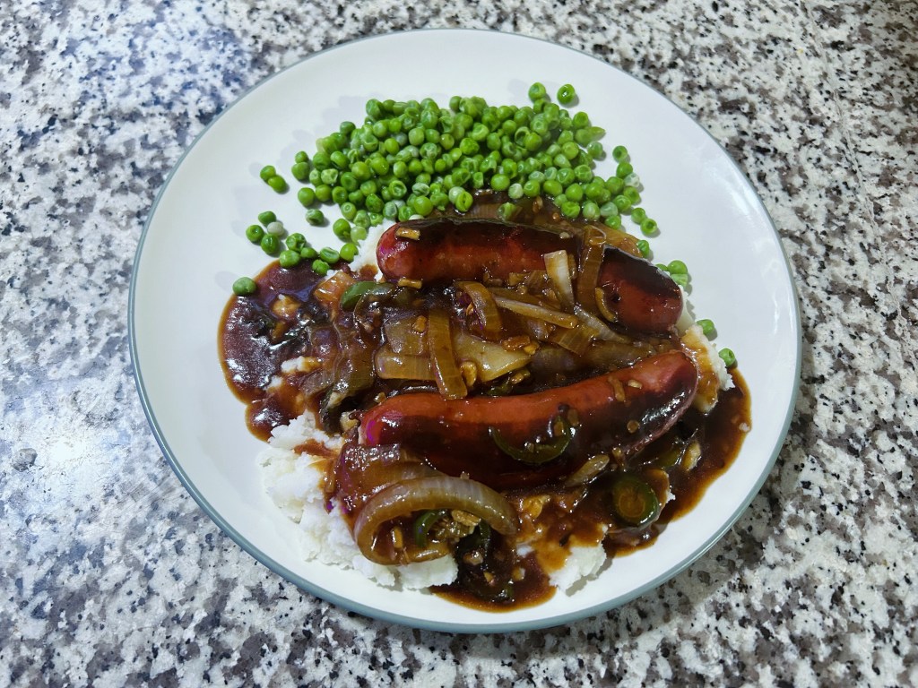 Bangers & Mach. A weird Irish meal that’s onion gravy, mash potato and sausage served with green peas.