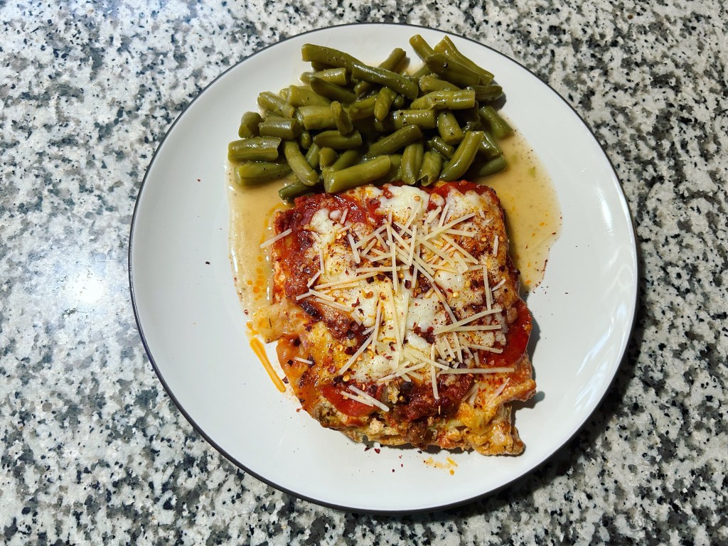 Lasagna with green beans. I was so tired so I made a microwave meal.