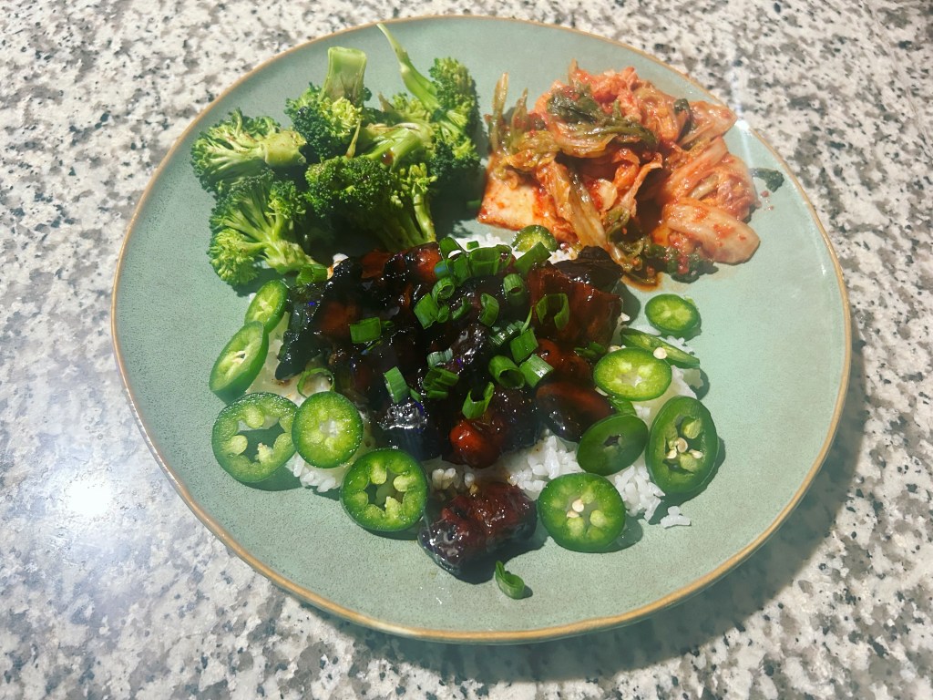 Date night! Sriracha soy pork belly with kimchi and broccoli. This was a first. I liked it. I know what to do different next time.