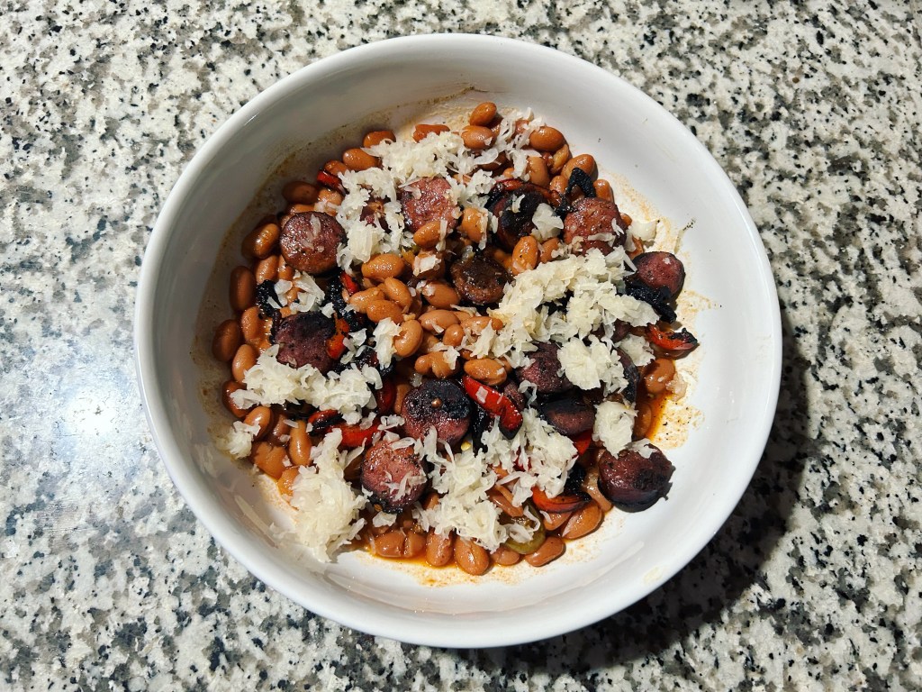 Ranch style beans with grilled sausage, jalapeño and sauerkraut. I accidentally sort of burned the sausage a little but it still managed to be tasty.