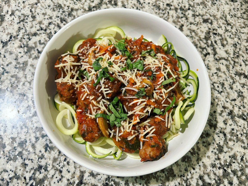 Meatballs over zucchini spirals with a mushroom carrot marinara sauce.