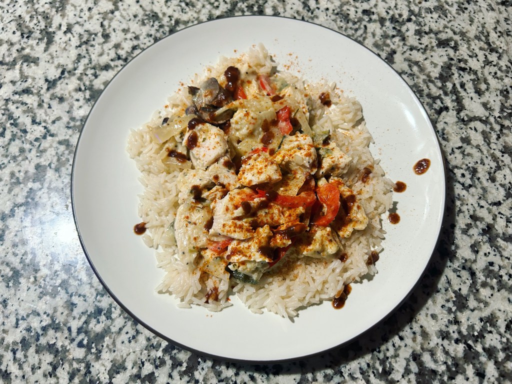 Poblano pepper sauce chicken with veggies & rice.