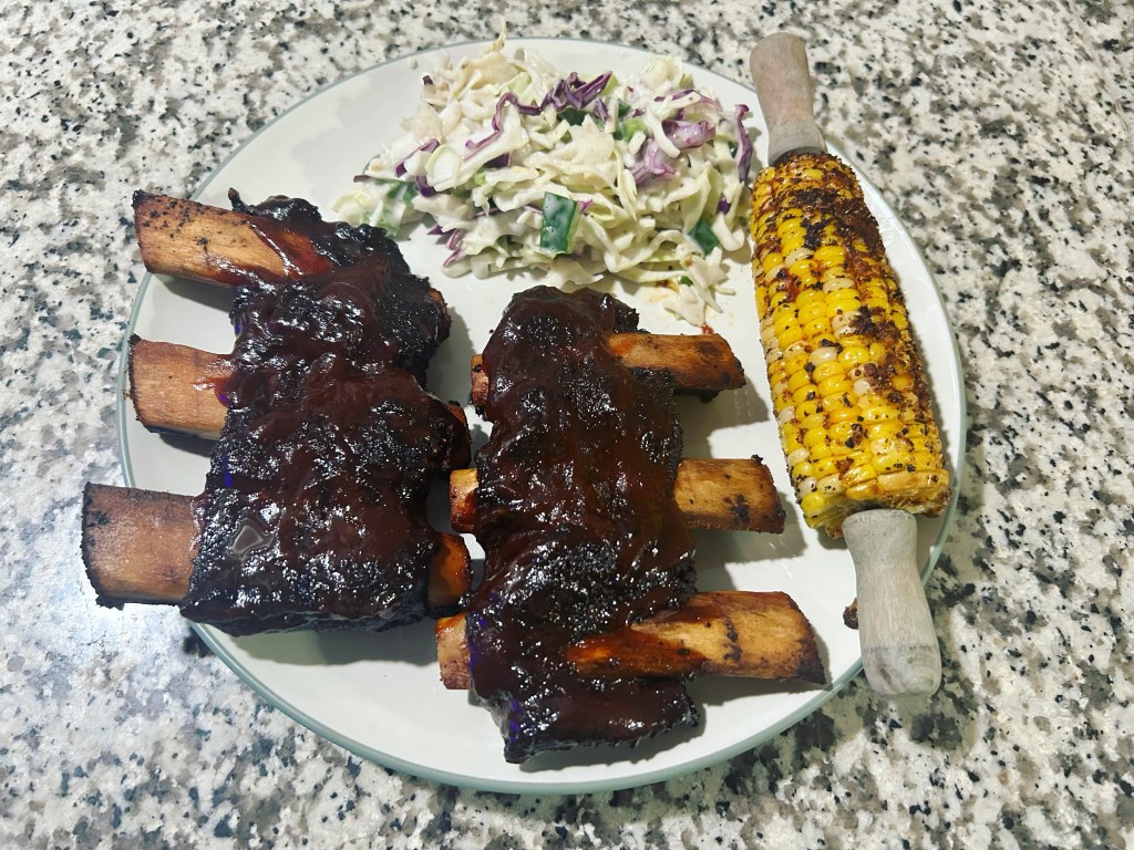 Beef ribs w/ slaw and corn on the cob.