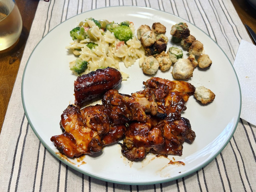 After the rodeo I went to see my mom for a little bit. She was good. I went to the store and bought the things I needed for dinner. I was cooking. I made some BBQ chicken thigh, sausage links, okra. Yvette’s daughter made some yummy pasta. We had a little feast. After eating we sat outside and enjoyed the nice evening. I got to really hang out with the kids. It was a good day.