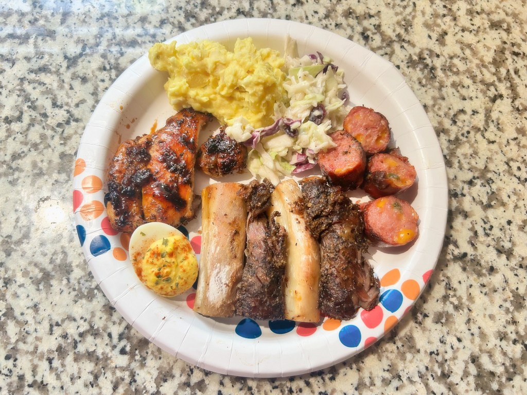 Memorial Day Feast!! I made beef ribs, chicken thigh, sausage, slaw and beans. Yvette brought some potato salad.