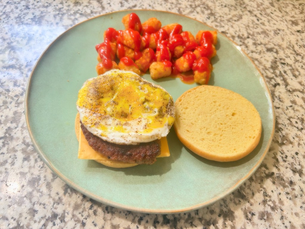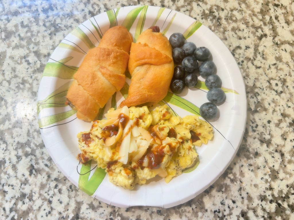 Brunch pt 2. Breakfast sausage croissants made by me, scrambled eggs and blueberries.