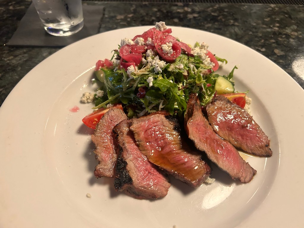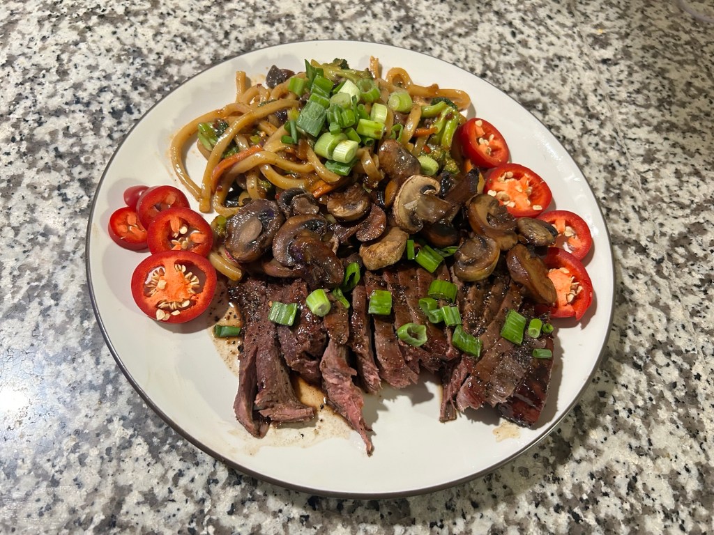 Udon noodle stir-fry with a sriracha soy glazed steak.