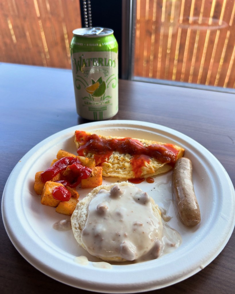 I slept very well considering I was in a hotel room. Being right next to the cold AC had to have helped. I woke up for a shower and headed down for some coffee in the lobby area. They actually had a really nice breakfast spread. Sausage biscuits and gravy, sausage links, potato’s, scrambled eggs, egg white veggie omelette. Muffins, bagels, oatmeal, cereal, etc…. I had a little sample. I can’t deny food.