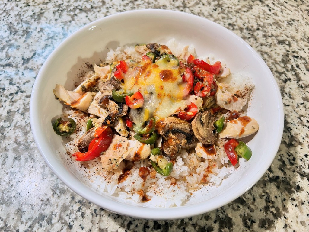 Chipotle chicken and lime with peppers, mushroom and sticky rice.