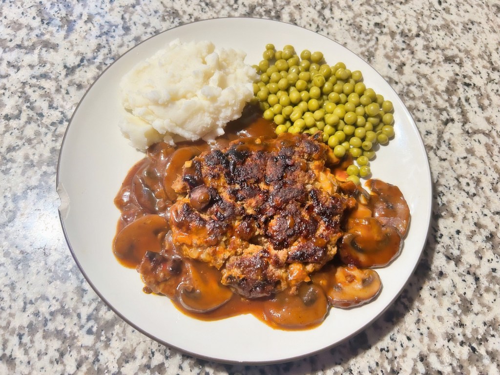 Salisbury Steak w/ peas and mashed potato.