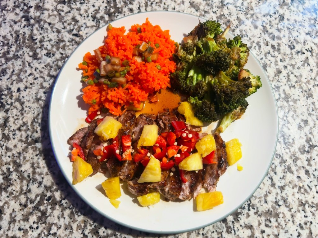 Caribbean jerk pork with red rice and broccoli.