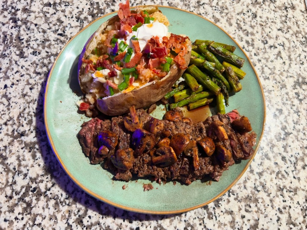 NY strip steak w/ baked potato, sautéed mushrooms and grilled asparagus.