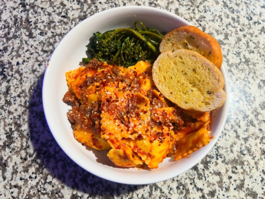 Cheese ravioli with meat sauce and broccolini.
