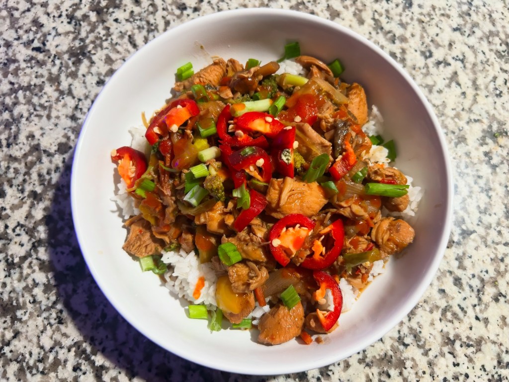 Chicken stir-fry with mushrooms, bell peppers, onion and broccoli served over sticky rice and garnished with red jalapeños and green onion.