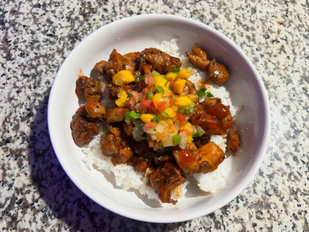 Mango habanero chicken thigh over sticky rice. This meal hurt me with the heat.
