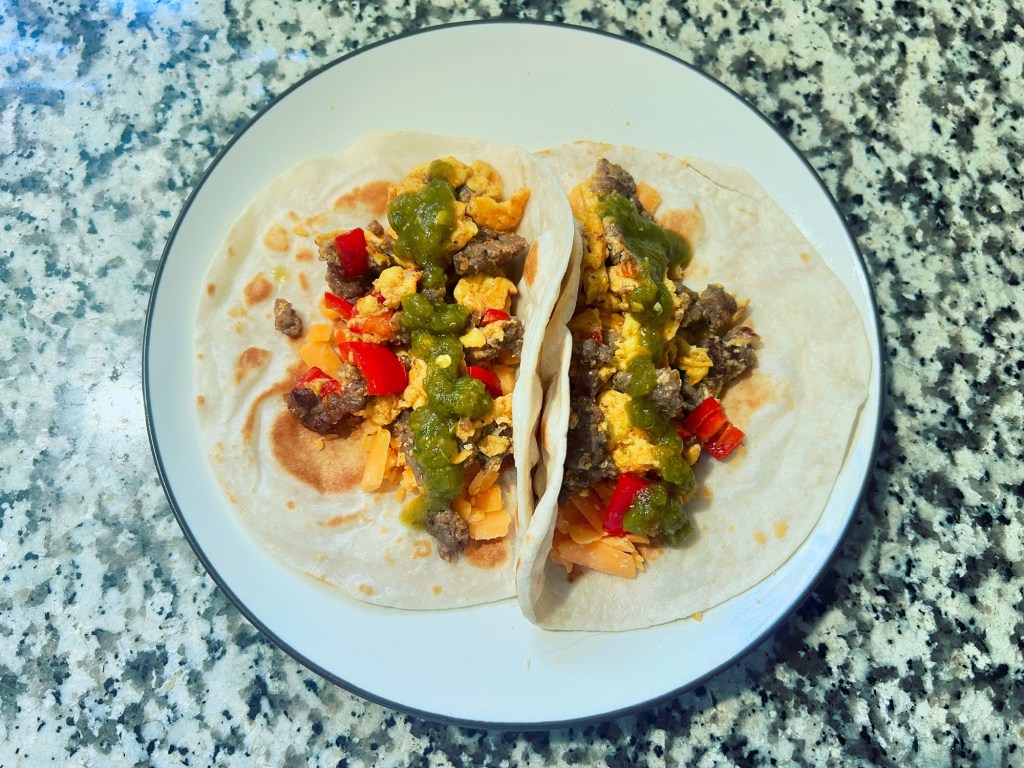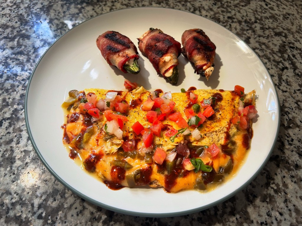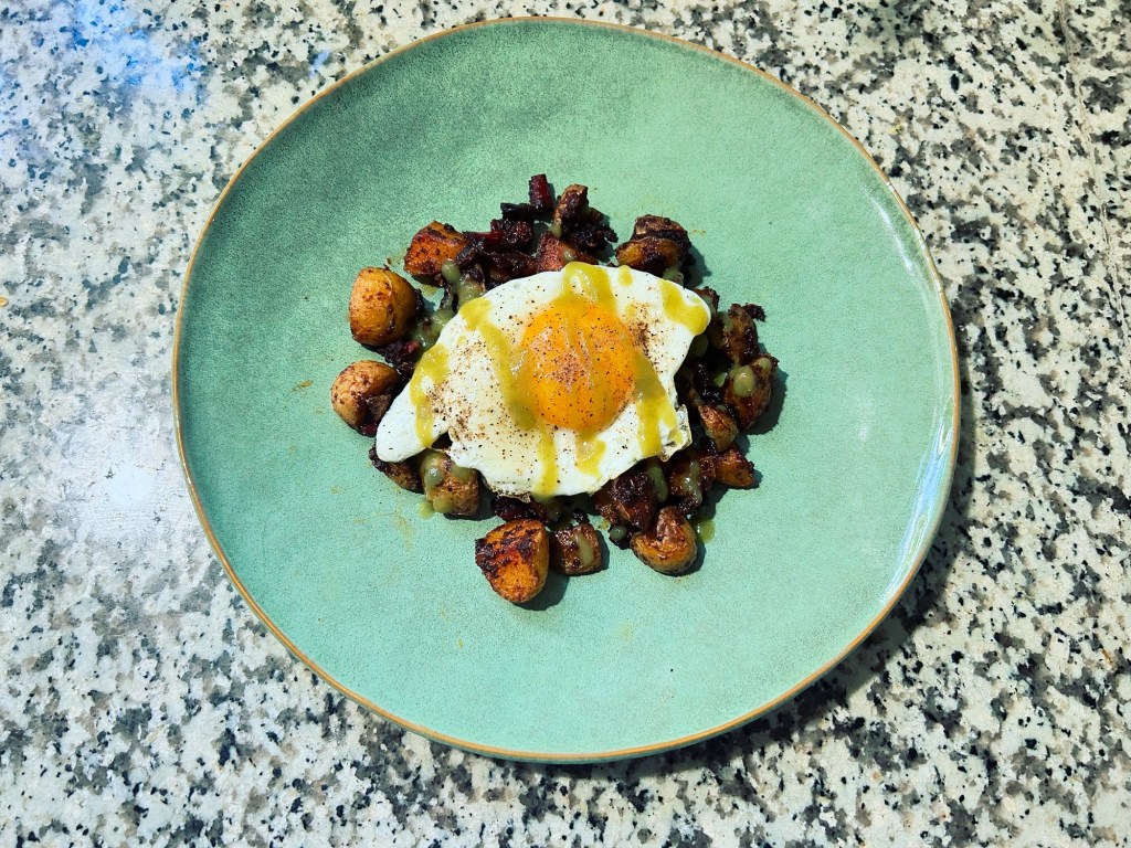 Breakfast baked potato. Sunny egg, bacon, cheese w/ green onion & jalapeño.