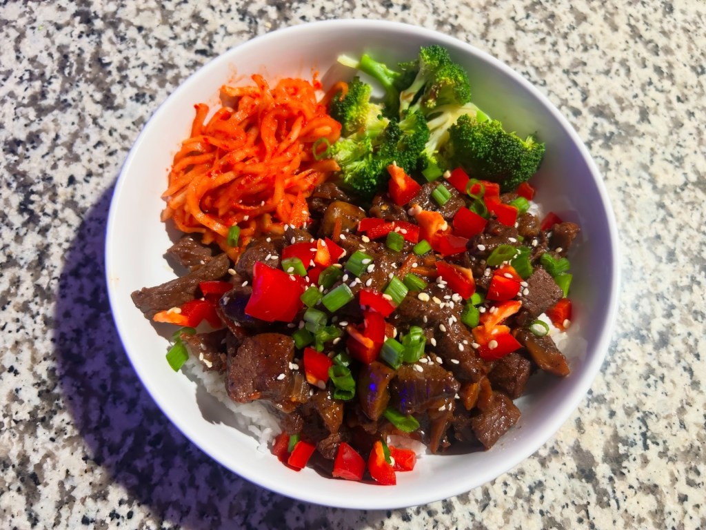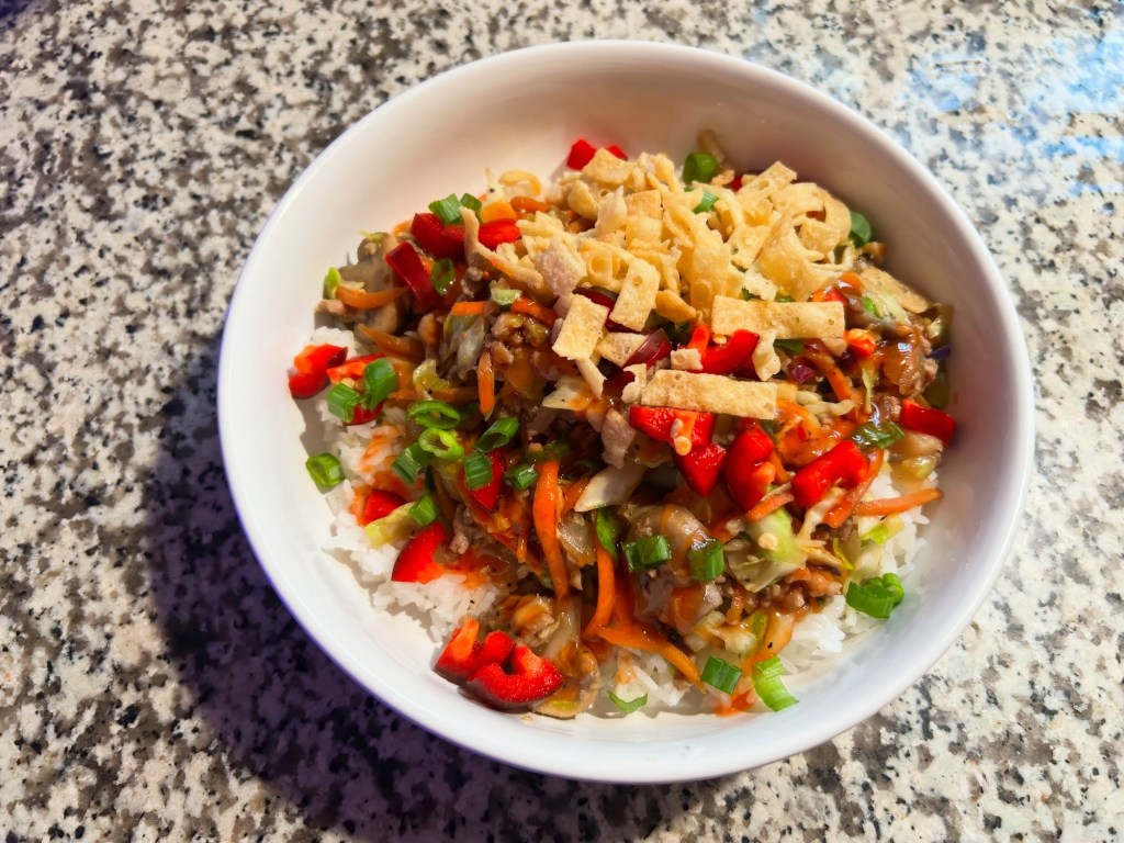 Chicken stir-fry with mushrooms, bell peppers, onion and broccoli served over sticky rice and garnished with red jalapeños and green onion.